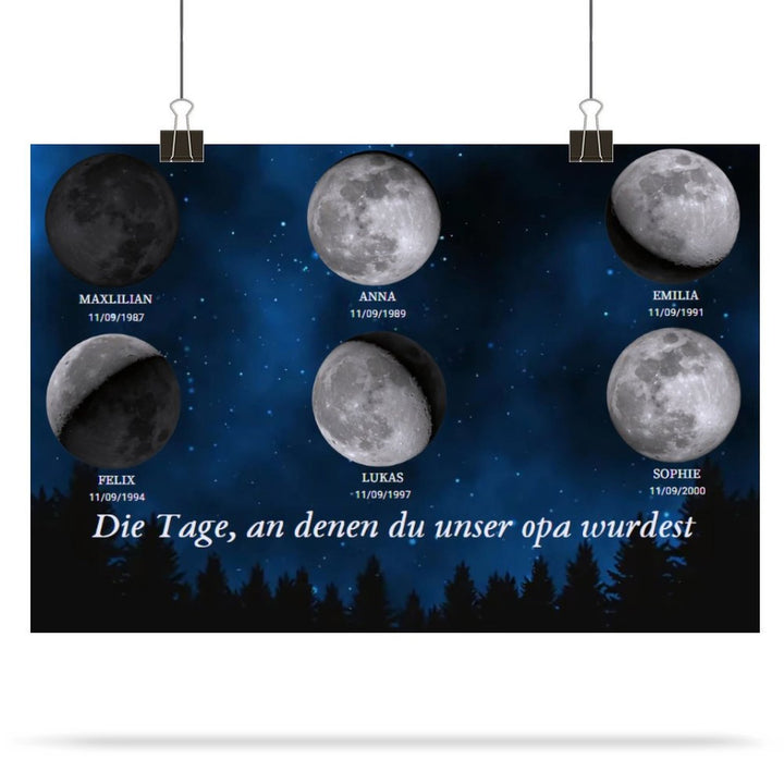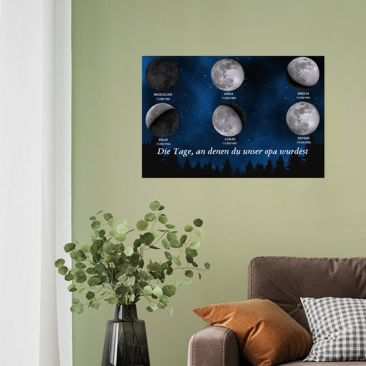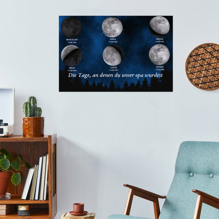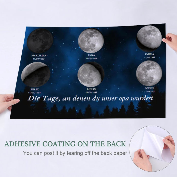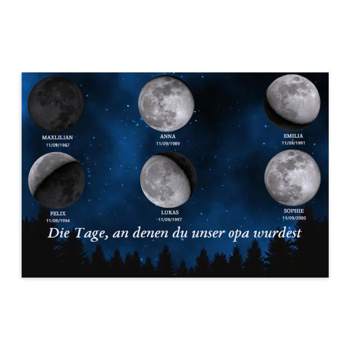 Haben Sie sich jemals gefragt, wie der Mond in der Nacht aussah, als Ihre Liebsten geboren wurden? Stellen Sie sich nun ein atemberaubendes, maßgeschneidertes Kunstwerk vor, das die exakte Mondphase für den Geburtstag jedes Familienmitglieds anzeigt, wunderschön angeordnet, um die kosmische Verbindung zu feiern, die Sie alle teilen.