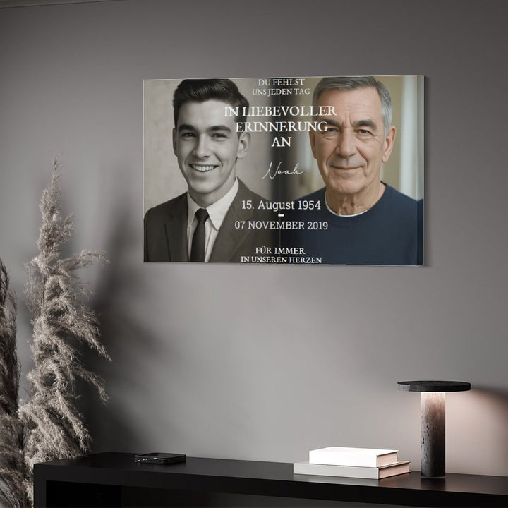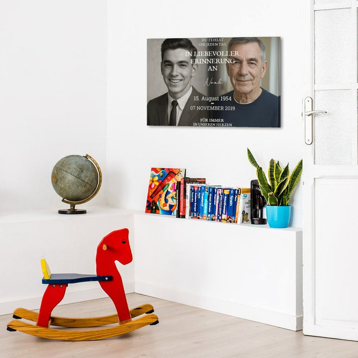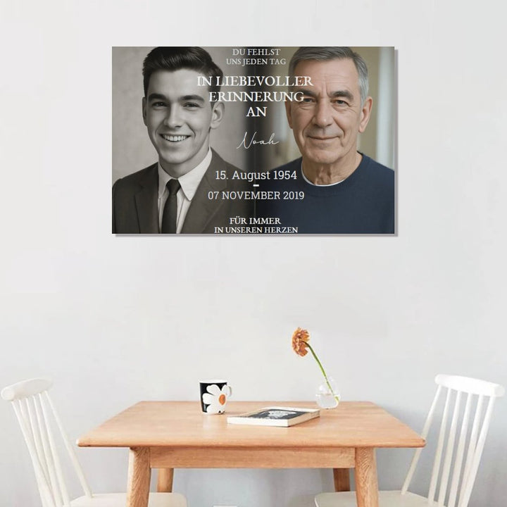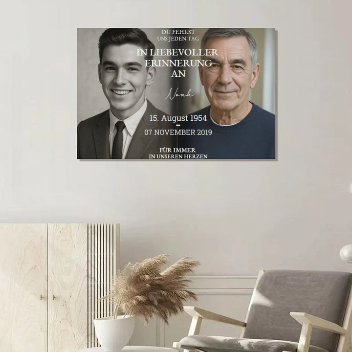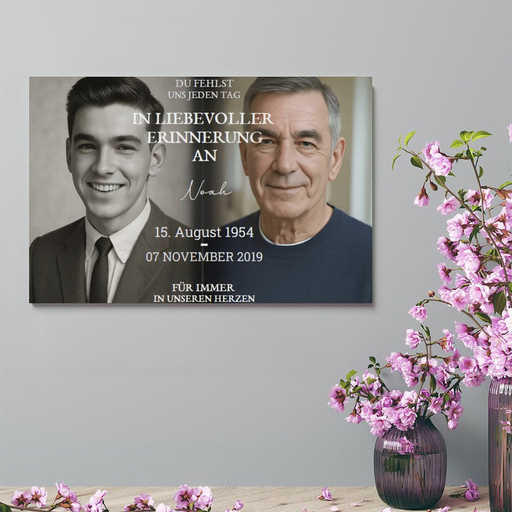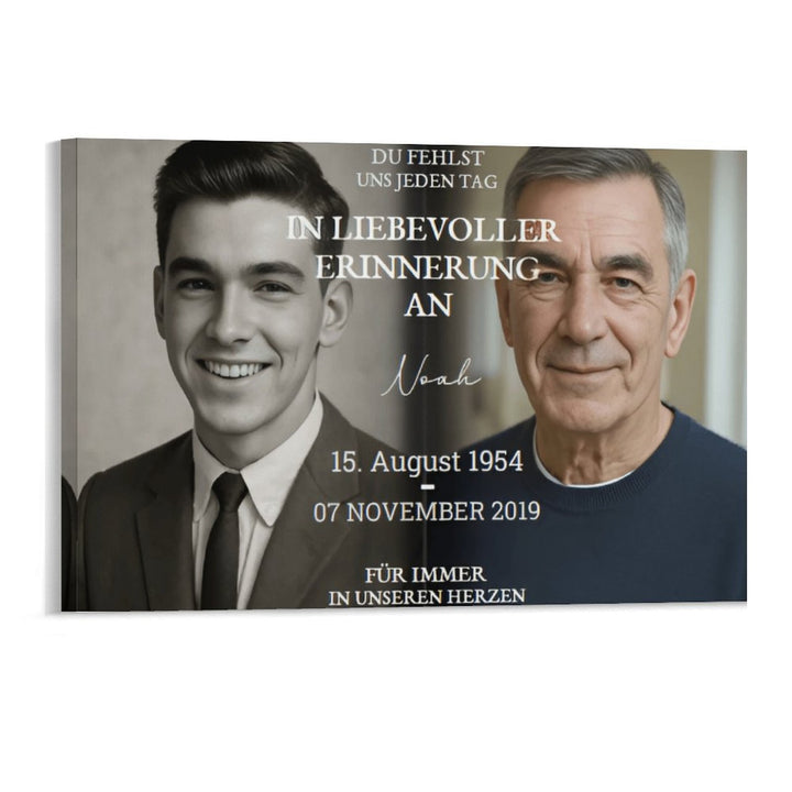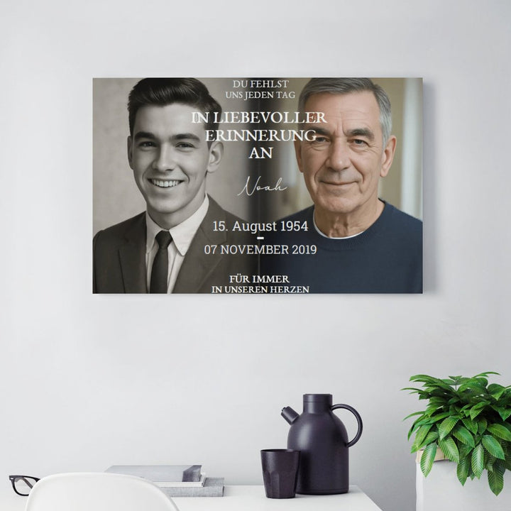 Wenn Worte fehlen, kann eine liebevolle Erinnerung Trost spenden. Diese personalisierte Gedenk-Leinwand wurde mit tiefem Mitgefühl entworfen, um das Leben und die Erinnerung an einen besonderen Menschen zu ehren. Fügen Sie Ihre schönsten Fotos hinzu, um ein zeitloses und persönliches Kunstwerk zu schaffen, das die unvergesslichen Momente für immer festhält.